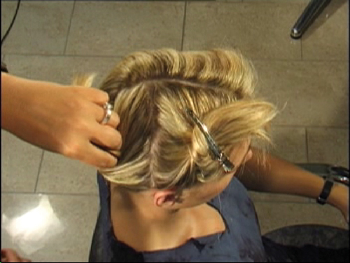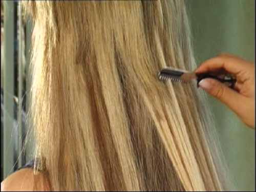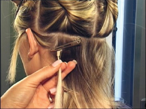 Quindi prendi una sezione e separa una ciocca dei tuoi capelli con la pinza di separazione. Assicurati che il rapporto tra la quantità dei tuoi capelli e la quantita’ della ciocca LA sia lo stesso. Metti la ciocca L.A. sulla ciocca che hai separato ad un cm dalla radice dei tuoi capelli.